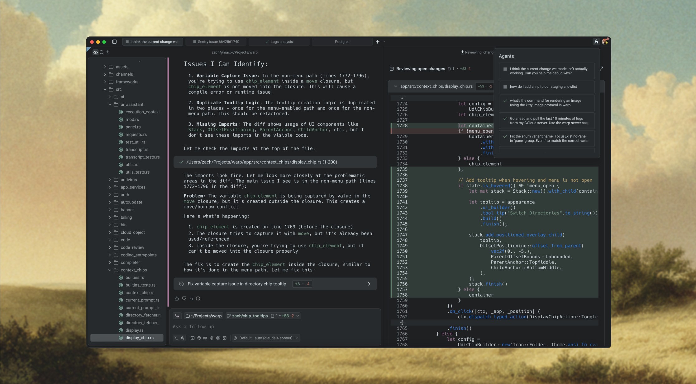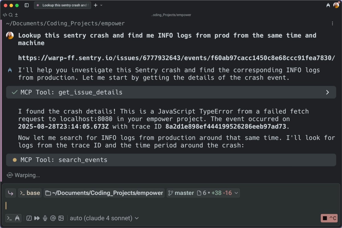 Use Warp to summarize user logs, debug Sentry errors, and even generate SQL queries in your REPLs
