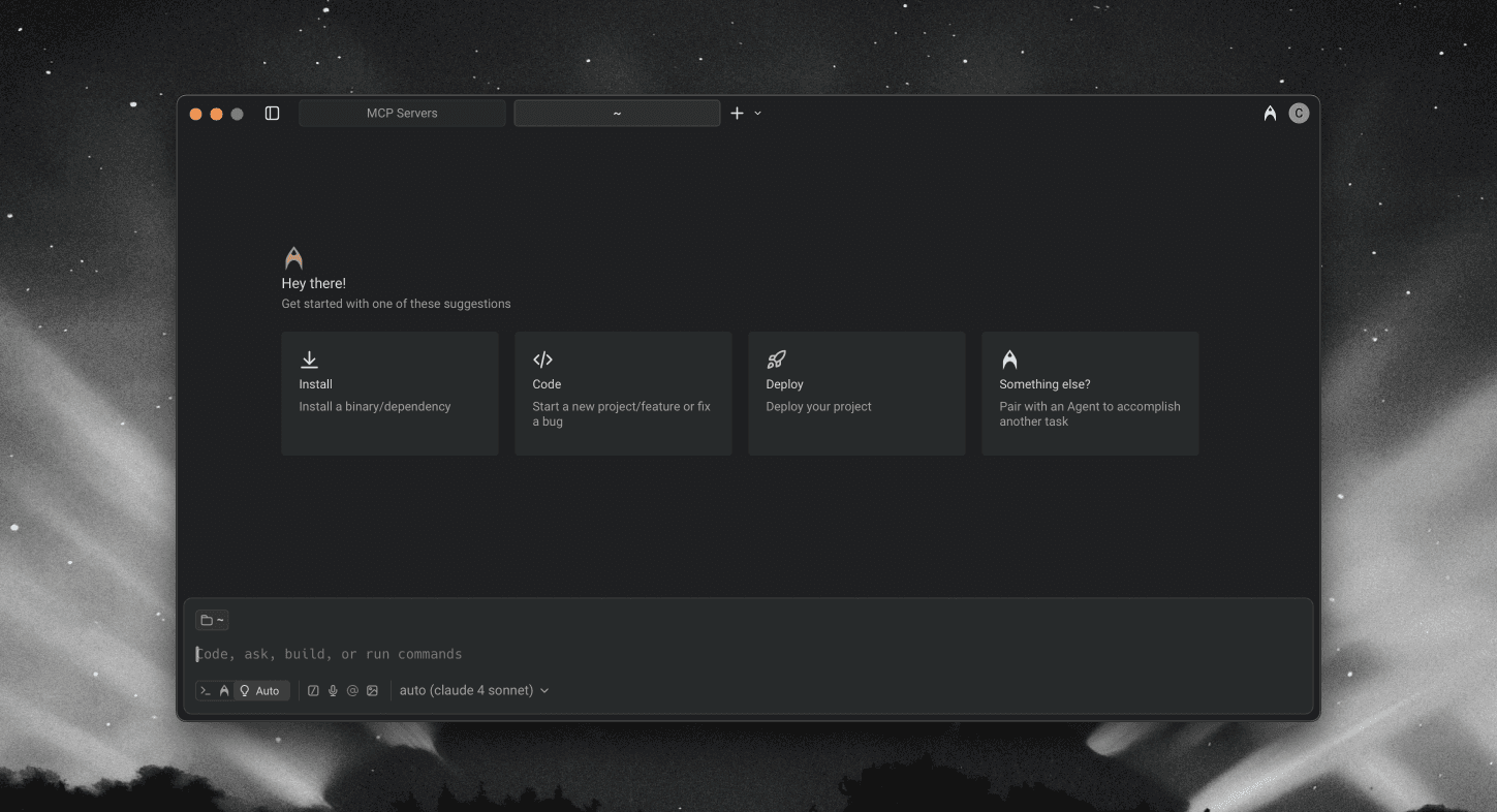 Use MCP to make external context available to Warp. Add MCP servers from services like Linear, Figma, Slack, and Sentry.
