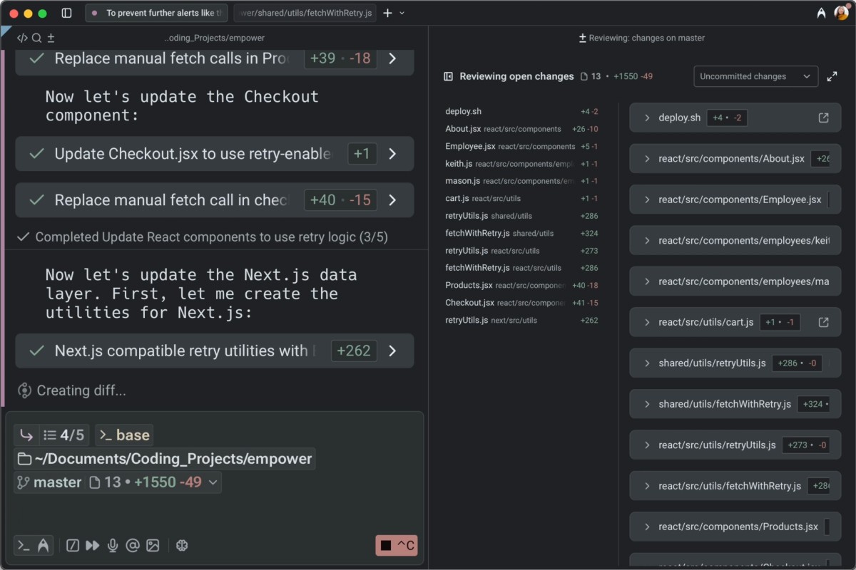Review changes in context, accept or reject diffs, and re-prompt agents until the output matches your expectations.